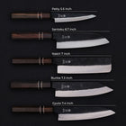 • Blade Types: Gyuto (7.1 in / 180mm), Nakiri (7.1 in / 180mm), Petty (5.5 in / 140mm), Santoku (6.7 in / 170mm), Bunka (7.3 in / 185mm)